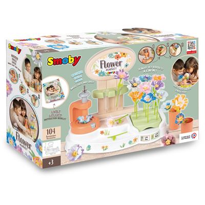 Mit dem kreativen Smoby Flower Market können Kinder ab 3 Jahren ihre ganz eigenen Blumen designen und zu hübschen Blumensträußen zusammenfügen. Mit Hilfe der einzigartigen, mechanischen Blumen-Kreations-Maschine lassen sich spielend leicht immer wieder neu Blüten-Kreationen erstellen und zusammenstecken: hierzu wird der obere kurze Teil des Stiels unten in die Blumenpresse eingelegt, darauf werden zwei Stoff-Blütenblätter gelegt. In den oberen Teil der Presse wird der passende Blütenstempel eingesetzt und dann durch leichten Druck mit den anderen Teilen der Blüte zusammengefügt. Zum Schluss wird die Neuschöpfung noch in den langen Stängel gesteckt, fertig ist das selbst entworfene Exemplar! So entstehen immer wieder neue und ganz unterschiedliche Blumen-Kreationen. Die Blüten lassen sich auf Wunsch auch wieder auseinandernehmen, so dass das Spiel beliebig wiederholt und neu gespielt werden kann. Dank der mitgelieferten Vasen und Papiertüten lassen sich die Blumen auch zu Sträußen zusammenfassen und können so an Freunde oder Eltern verschenkt oder verkauft werden.