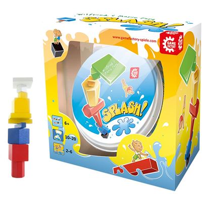 SPLASH! - IST JEMAND INS WASSER GEFALLEN? Splash! ist ein schnelles und kompaktes Stapelspiel für 2-6 nervenstarke Spieler mit einem guten Augenmaß. Mit Bausteinen in gleicher Farbe oder Form baut ihr einen Sprungturm, aber ins Wasser fallen dürfen nur eure Mitspieler. Stellt fest, wie geschickt ihr seid - oder geht baden!