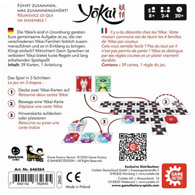 Die Yokai’s sind in Unordnung geraten. Eure gemeinsame Aufgabe ist es, die vier verschiedenen Yokai-Familien farblich zusammenzuführen und so in Einklang zu bringen. Klingt einfach? Mitnichten! Denn Sprechen ist verboten! Yokai bietet kurze Regeln und lang anhaltenden Spielspaß!
