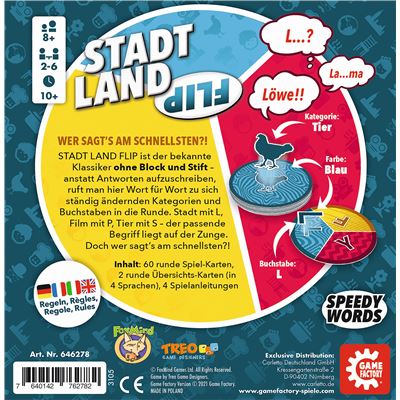 STADT LAND FLIP ist der bekannte Klassiker ohne Block und Stift - anstatt Antworten aufzuschreiben, ruft man hier Wort für Wort zu sich ständig ändernden Kategorien und Buchstaben in die Runde. Stadt mit L, Film mit P, Tier mit S – der passende Begriff liegt auf der Zunge. Doch wer sagt’s am schnellsten?!