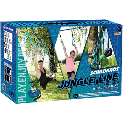 Die neue Schildkröt Jungle Line ist die Innovation für den Bereich Garten-/Bewegungsspiele schlechthin. Bauen Sie sich und ihren Kindern einen eigenen coolen Hangelparcour im Garten oder Park auf und trainieren Sie wie ein Ninja-Kämpfer. Die Jungle Line (sehr ähnlich einer Slackline) ist 11 Meter lang und 5cm breit. Eingenäht sind insgesamt 14 Schlaufen, in die die 7 Hindernisse zum Hangeln eingehängt werden können. Im Set enthalten sind 2 Gymnastikringe, 2 Sprossen (Affenschaukeln) und 2 Affenfäuste, jeweils mit kurzem Seilstück und Delta-Sicherheitskarabiner. Durch die eingenähten Ösen können die Hindernisse nicht verrutschen. Der komplette Lieferumfang inkl. Ratschenschutz kann praktisch in die ebenfalls enthaltene Nylontasche gepackt werden, so bleibt alles zusammen und die Jungle Line kann jederzeit überall hin mitgenommen werden! Maximale Belastbarkeit: 120kg. Altersempfehlung 5+. Über Schildkröt: Die über 100 Jahre alte deutsche Marke Schildkröt gilt als Erfinder des Tischtennisballs. Heute bietet Schildkröt neben Tischtennis auch eine sehr umfangreiche Funsport-, Rollsport- und Fitness-Kollektion an und gilt in gewissen Bereichen als Marktführer. Die Produktentwicklung erfolgt ausnahmslos in Deutschland. Die weltweiten Produktionsstätten werden streng überwacht und genügen höchsten Sozialstandards.