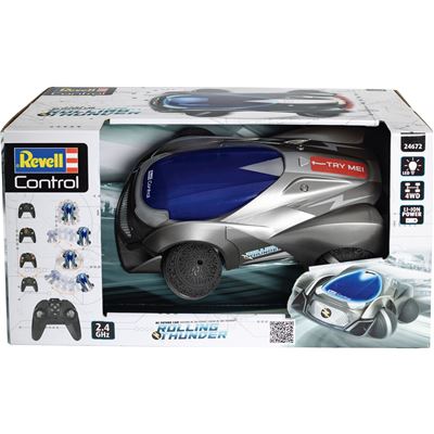 Die Zukunft schon heute erleben. Dieses RC Car hebt das Fahrerlebnis auf die nächste Stufe: das RC Future Car Rolling Thunder! Mit seiner innovativen Antriebstechnologie und seinem coolen futuristischen Design bietet dieses Fahrzeug ein nie dagewesenes Fahrerlebnis. Die Kugelreifen und der 4WD Antrieb ermöglichen dem Rolling Thunder sich in alle Richtungen zu bewegen. Kreisfahrten und 360°-Drehungen sorgen für zusätzlichen Nervenkitzel. Eine Fahrzeit von bis zu 17 Minuten, die 2.4 GHz Fernsteuerung, Li-Ion Akku und USB-Ladegerät gehören genauso zur Vollausstattung wie auch beeindruckende LED-Lichteffekte, die diese Neuentwicklung perfekt in Szene setzen. Das Revell Control Future Car Rolling Thunder ist DAS unvergessliche RC-Erlebnis.