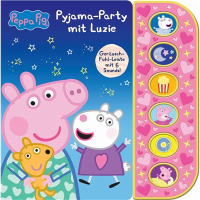 Sechs unterhaltsame Geräusche und eine Fühlleiste machen dieses Soundbuch auf vielfältige Weise erfahrbar. Peppa und Luzie feiern zusammen eine Pyjama-Party. Die Geschichte wird akustisch untermalt und auf der Geräuschleiste können kleine Leser Sterne und Herzen ertasten und so ihre feinmotorischen Fähigkeiten erweitern.