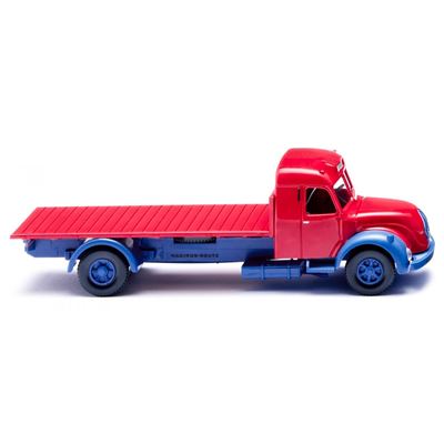 Die Farbgestaltung ist auffällig und stimmig: Fahrerhaus und Flachpritsche in himbeerrot, Kühlergrill, Kotflügel vorne und hinten sowie Fahrgestell inklusive Kardanteil und Tank in brillantblau. Der Grill ziert silberner Zierrat und das Magirus‑Emblem. Die Inneneinrichtung – Sitz und Lenkrad – sind weinrot gehalten. Felgen brillantblau, Türgriffe gesilbert, seitliche Winker und Spiegel vorhanden, Spritzlinge mit Scheibenwischer und Peilstangen setzen weitere Akzente. Stoßstange trägt schwarzen Schriftzug, an den Türen findet sich der schwarze Schriftzug „Magirus‑Deutz“, Rücklichter sind karminrot bedruckt.
