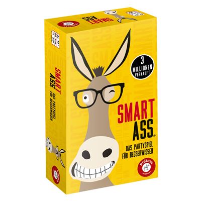 „Smart Ass“ ist ein lebhaftes Partyquizspiel für 2 bis 6 Personen ab 12 Jahren, in dem es darum geht, möglichst schnell Begriffe zu erraten – jeweils passend zu einer der Kategorien „Was bin ich?“, „Wer bin ich?“ oder „Wo bin ich?“. Das Spiel startet mit 360 Fragekarten, die farblich den drei Kategorien zugeordnet sind. Ein Farbwürfel bestimmt, welche Karte an der Reihe ist. Jede Karte enthält acht Hinweise, die der*die Vorleser*in nacheinander laut vorliest. Ab dem ersten Hinweis darf jede*r mitraten: wer die richtige Lösung zuerst nennt, gewinnt die Karte und bekommt einen Punkt.