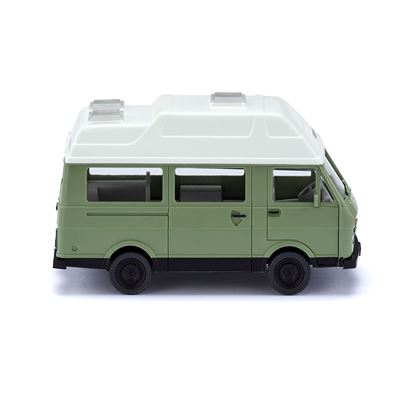 Der VW LT 28 mit Westfalia-Hochdach steht exemplarisch für eine Wohnmobilära, in der Pragmatismus und Individualität den Ton angaben. WIKING greift dieses Konzept auf und miniaturisiert den klassischen Transporter im Maßstab 1:87 – inklusive zeittypischer Ausstattung und charakteristischer Farbgestaltung. Die hellgrüne Karosserie mit weißem Hochdach erinnert an jene Fahrzeuge, die in den späten 1970er- und 1980er-Jahren zahlreiche Campingplätze und Reiserouten prägten.